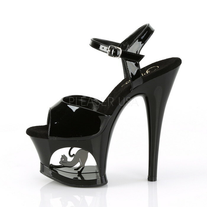 送料無料 Pleaser プリーザー 取寄せ 厚底サンダル 厚底 エナメル黒(ブラック)のアンクルストラップとアッパー くり抜きストーム シルバー色のネコ(猫)の飾り ハイヒール レディース コスプレ 衣装 ポールダンス 靴 大きいサイズ キャバ MOON-709CAT MOON709CAT/B/B-S